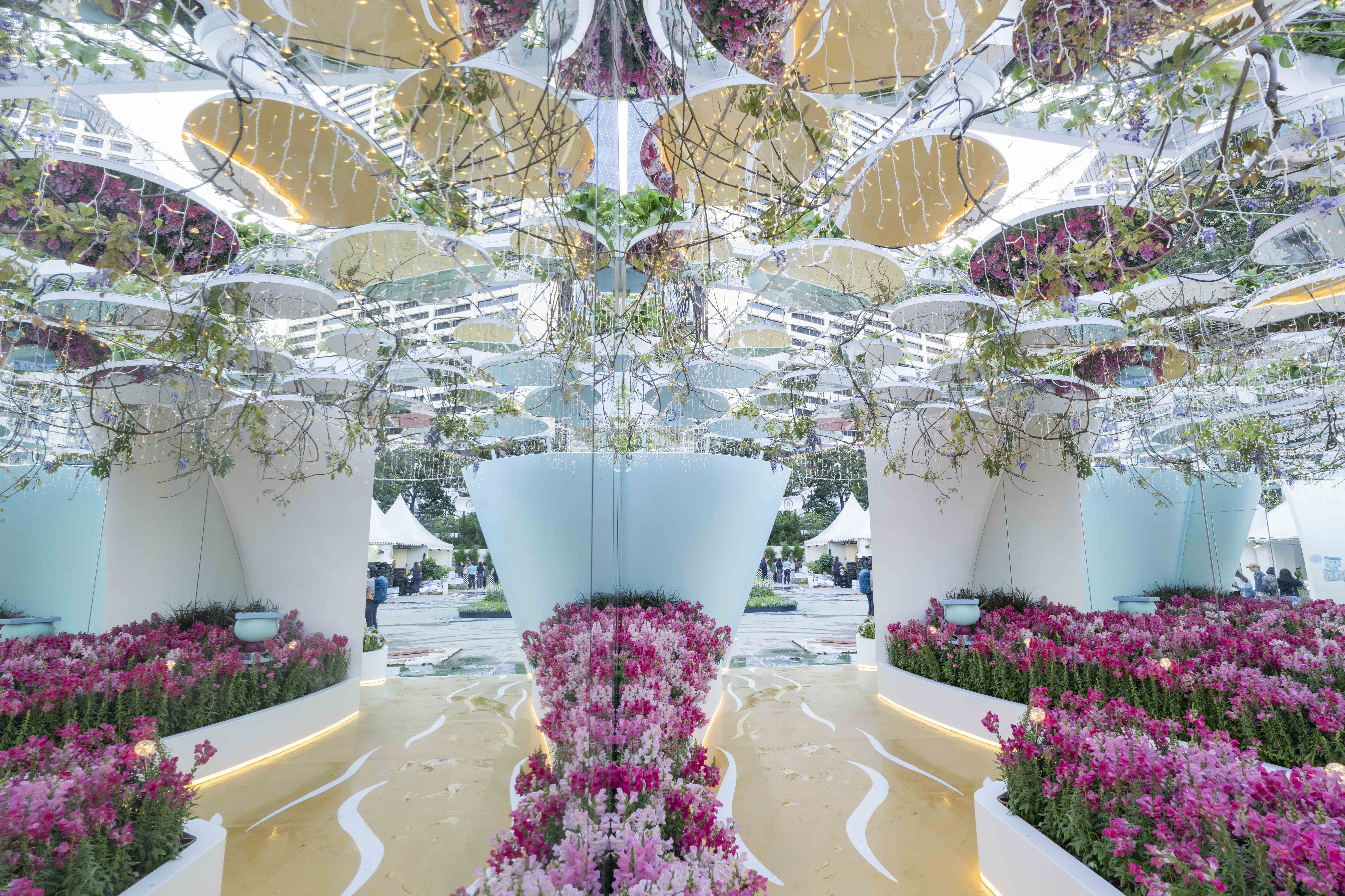 「後區-夢遊花境」以鏡面及燈光折射出無限花海,營造夢幻氛圍