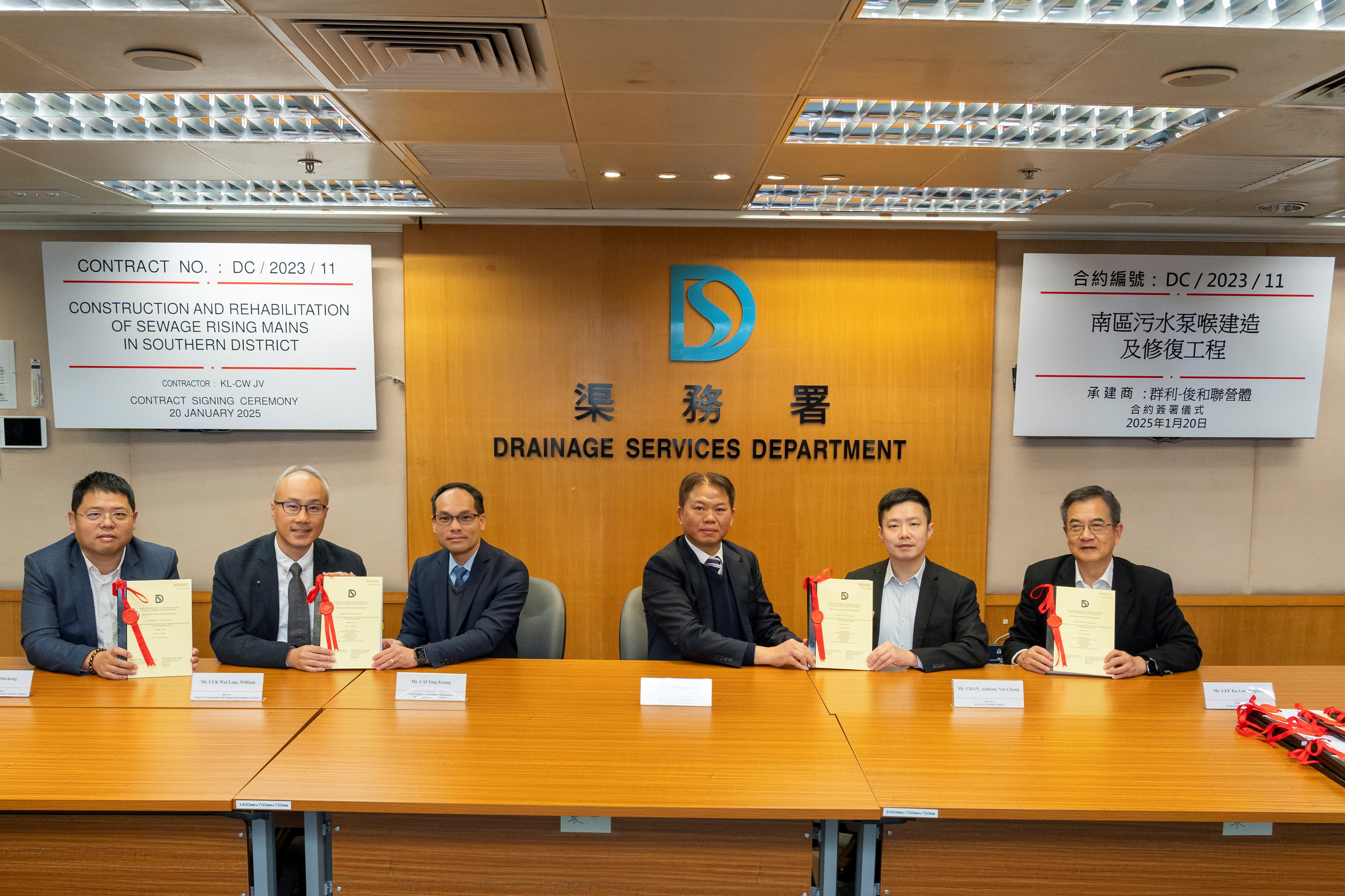 渠務署助理署長/污水處理服務李偉文先生(右三)及總工程師/顧問工程管理黎應強先生(左三)與群利集圑有限公司董事陳賢宗先生(右二)及俊和建築控股有限公司主席李家粦先生(右一)以及俊和建築工程有限公司董事陸偉霖先生(左二)及總經理(建造)丁至澄先生(左一)出席合約簽署儀式。