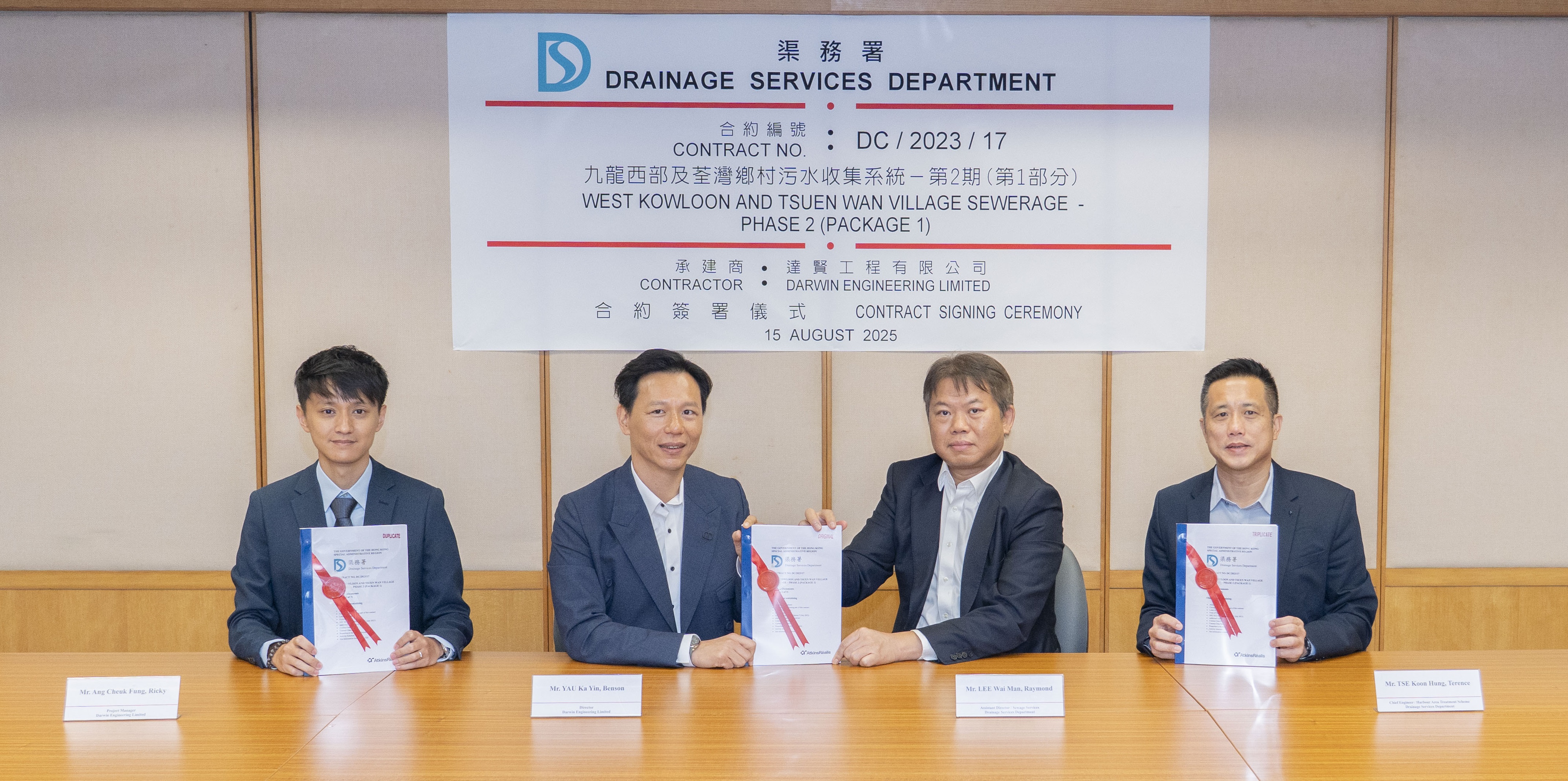 渠務署於2025年8月15日與達賢工程有限公司簽署一份總值約1億4,200萬元的工程合約,工程包括於荃灣的新村、和宜合和上葵涌及九龍西部的長坑建造約4.6公里長的污水渠。合約已於2025年7月25日展開,為期41個月。