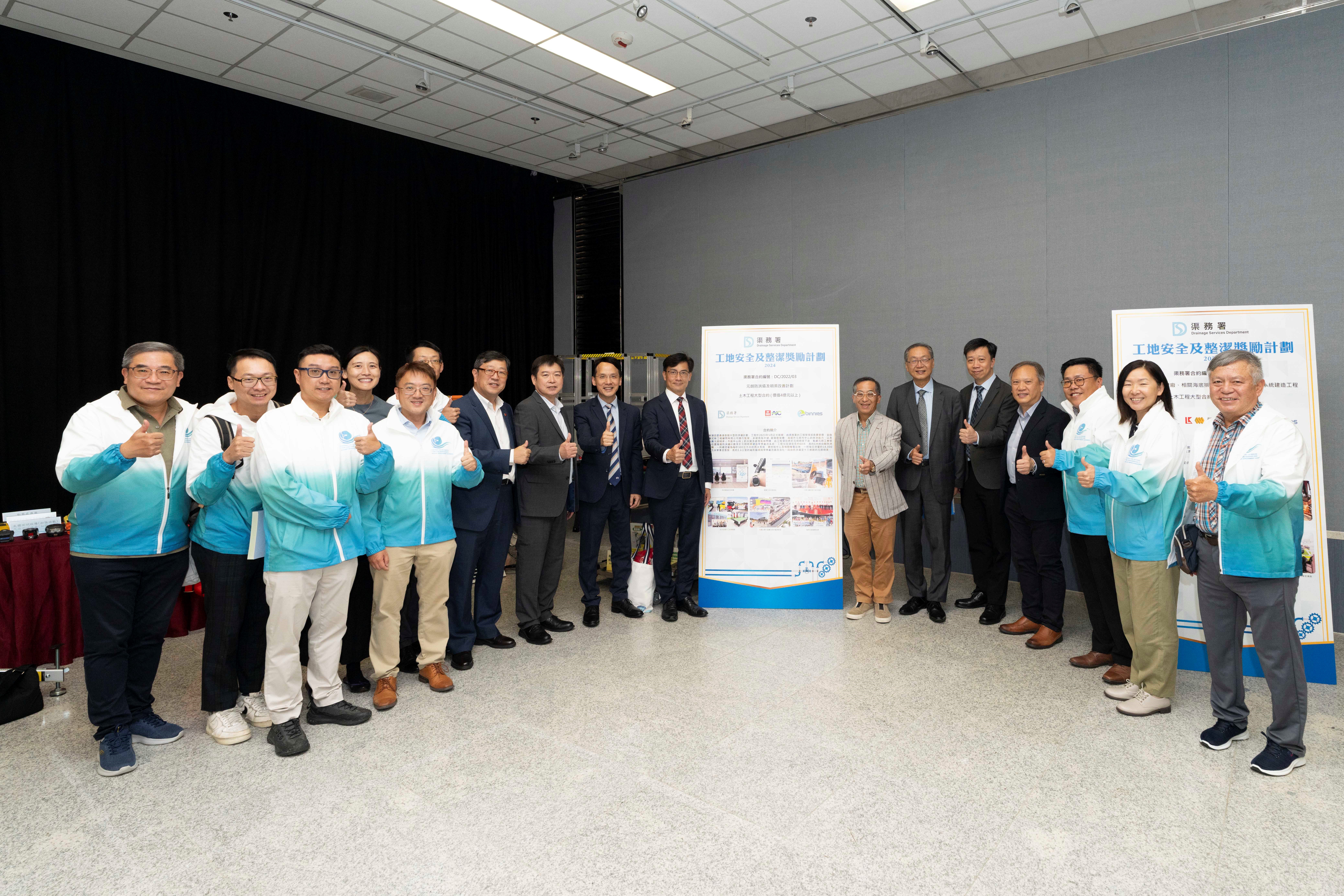 渠務署首長級人員、建造業議會何安誠主席、職業安全健康局首席顧問楊冠全博士,以及勞工處分區職業安全主任林慧貞女士與應對極端天氣的相關承建商及緊急應變隊伍合照。