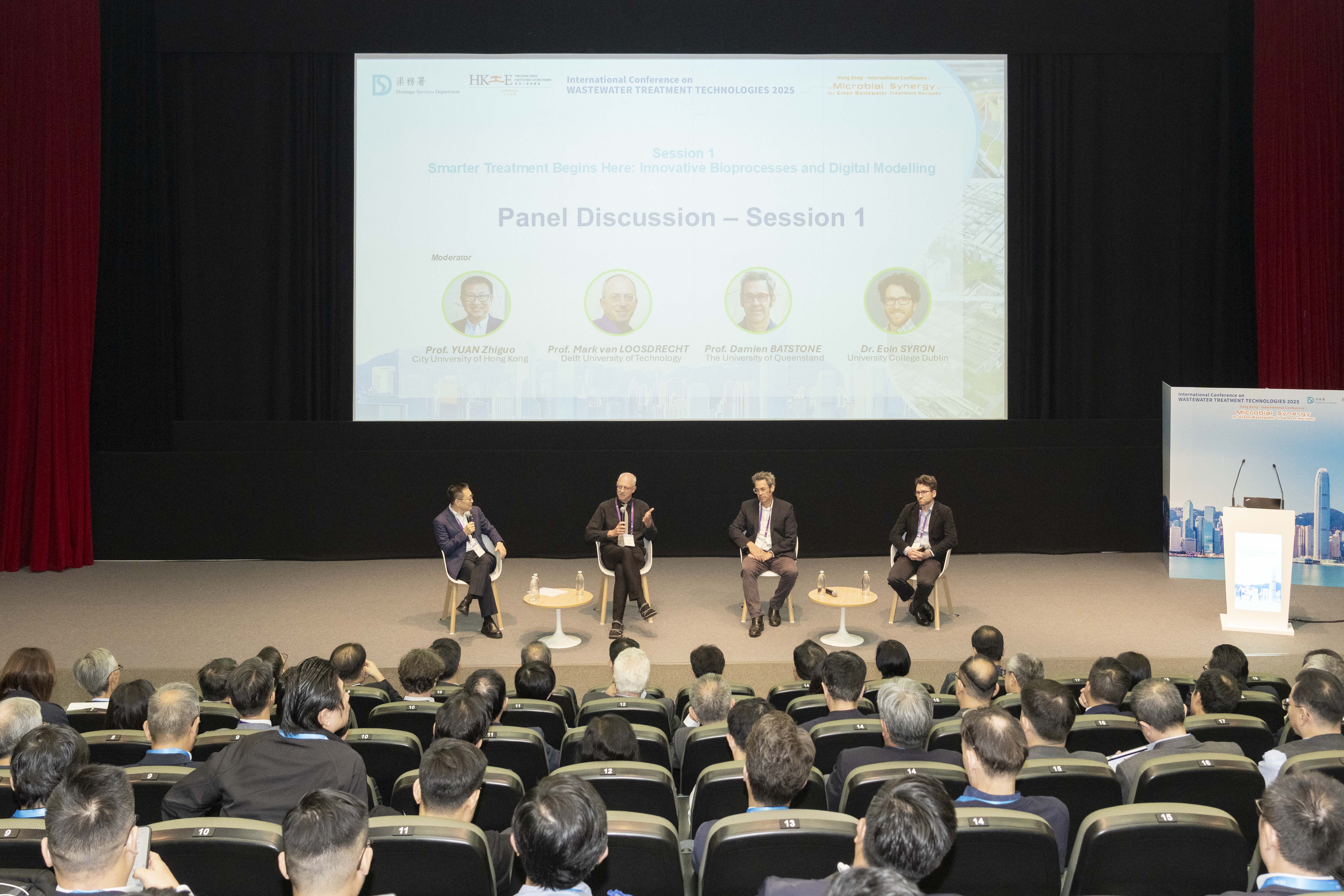 (左起)香港城市大學袁志國教授主持首節討論,與荷蘭代爾夫特理工大學Mark van Loosdrecht教授、澳洲昆士蘭大學Damien Batstone教授,以及愛爾蘭都柏林大學Eoin Syron博士,共同探討如何利用創新生物工藝與數碼建模技術,驅動污水處理邁向更智能的未來。