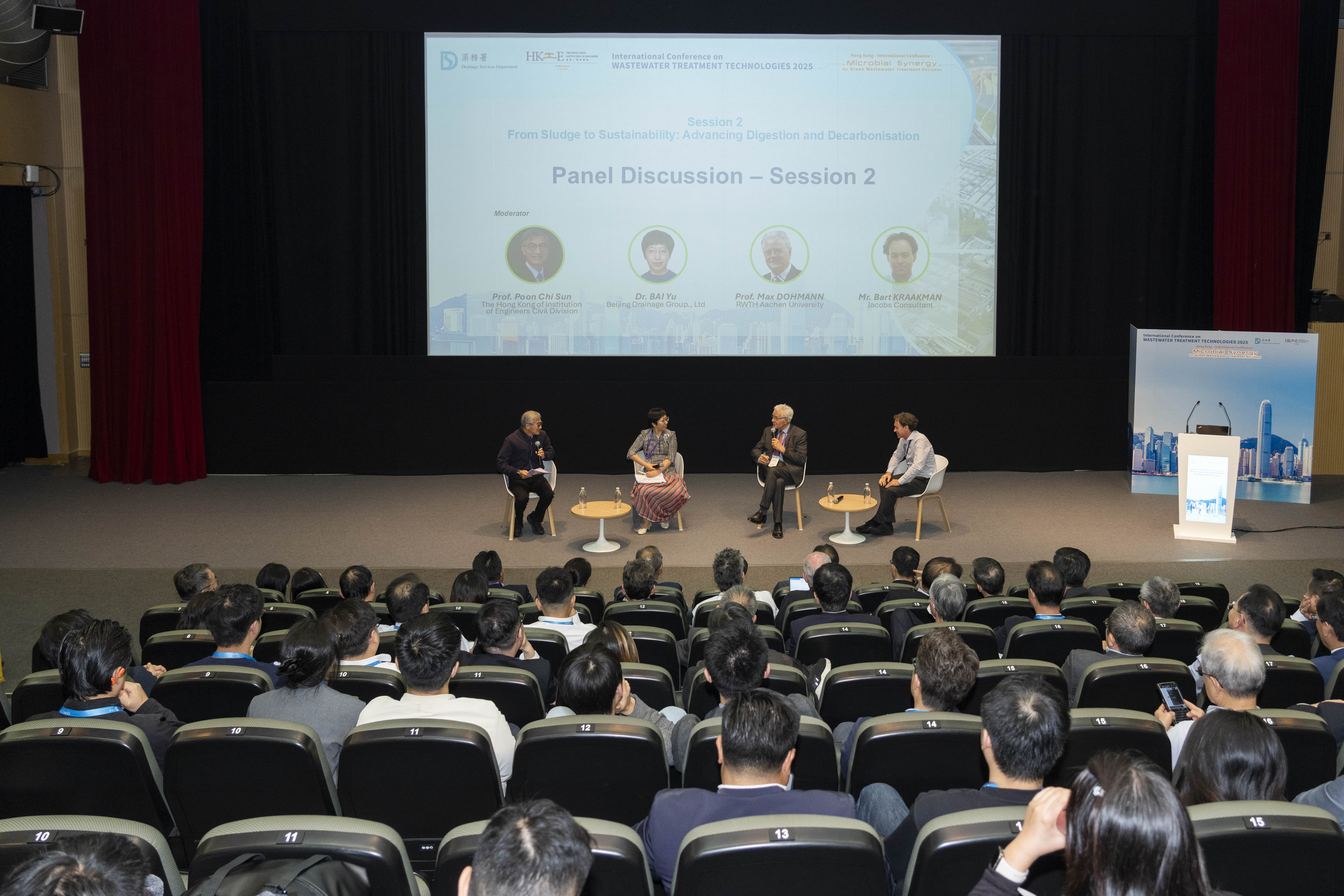 (左起)香港工程師學會土木分部委員潘智生教授主持第二節討論,與中國北京排水集團白宇博士、德國亞琛工業大學Max Dohmann教授,以及荷蘭Jacobs顧問公司Bart Kraakman先生,深入交流將污泥轉化為資源、推進厭氧消化與實現減碳目標的技術與策略。