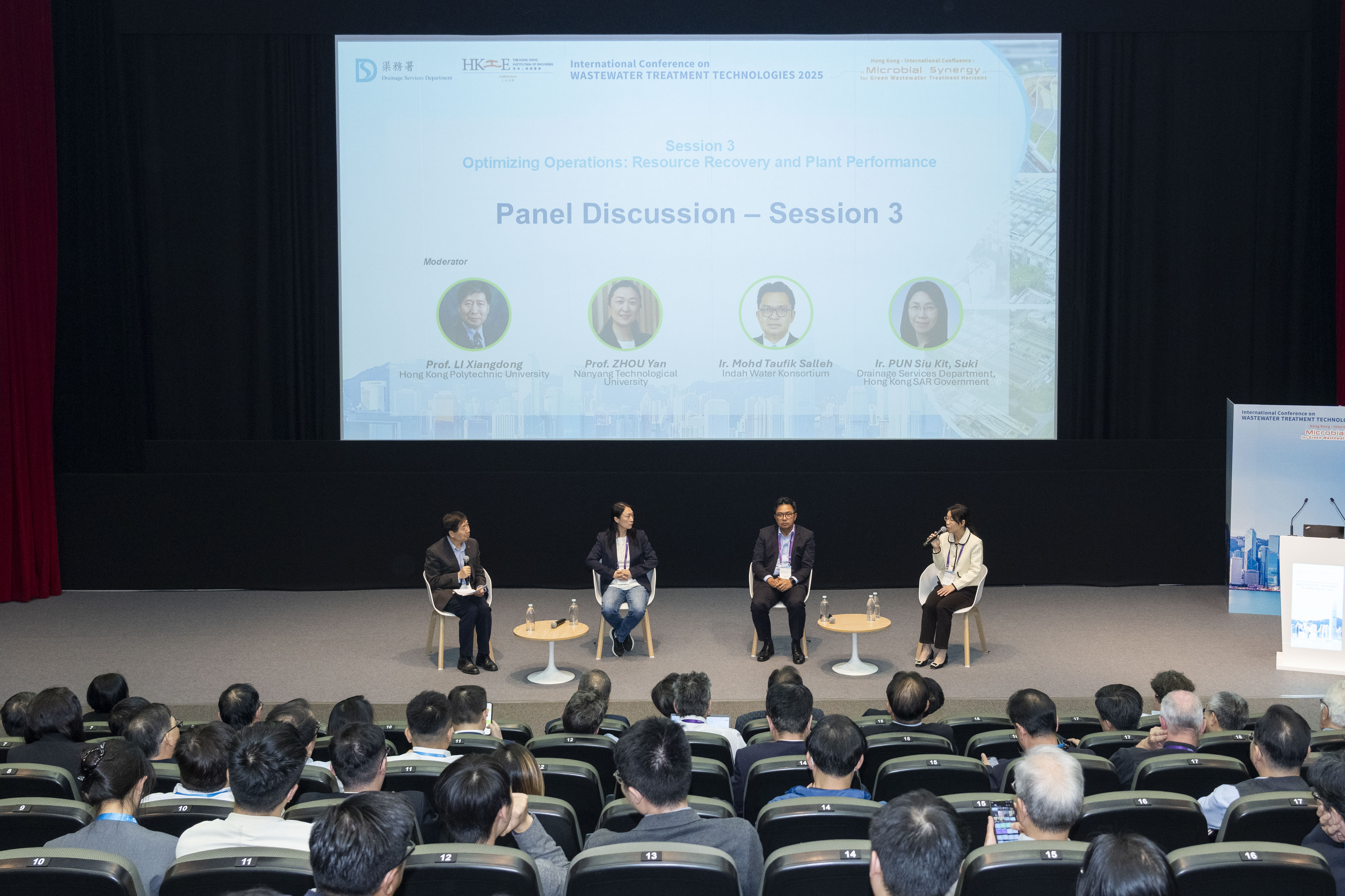 (左起)香港理工大學李向東教授主持最後一節討論,與新加坡南洋理工大學周巖教授、馬來西亞Indah Water Konsortium的Mohd Taufik Salleh工程師,以及本署潘小潔總工程師,分享在污水處理廠運營中優化效能、提升資源回收率的實踐經驗與創新方案。