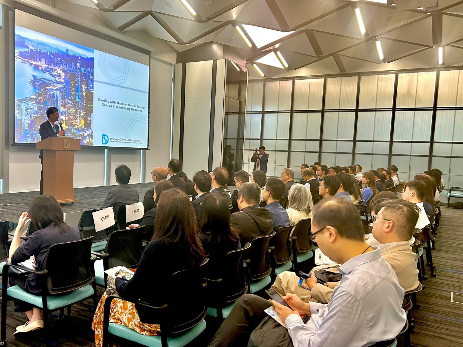 - 舉行雨季前持份者會議:向來自港鐵、領展、公用事業機構和物業管理界等23個持份者共超過50名代表分享了綜合防洪管理策略和雨季前的預防措施,並介紹了各種擋水設備及泵水設施的應用,積極部署及應對因暴雨或風暴潮帶來的水浸風險和影響。