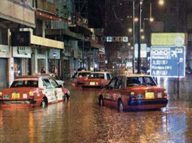 | Flooding at Hillier Street (2005) | Flooding at Leighton Road (2006) | Connaught Road Central during the black rainstorm (2008) |