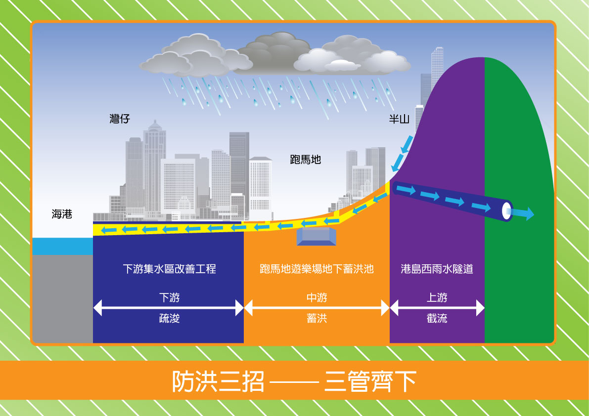 以下是渠务署为改善湾仔区水浸情况的防洪三招: