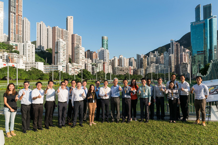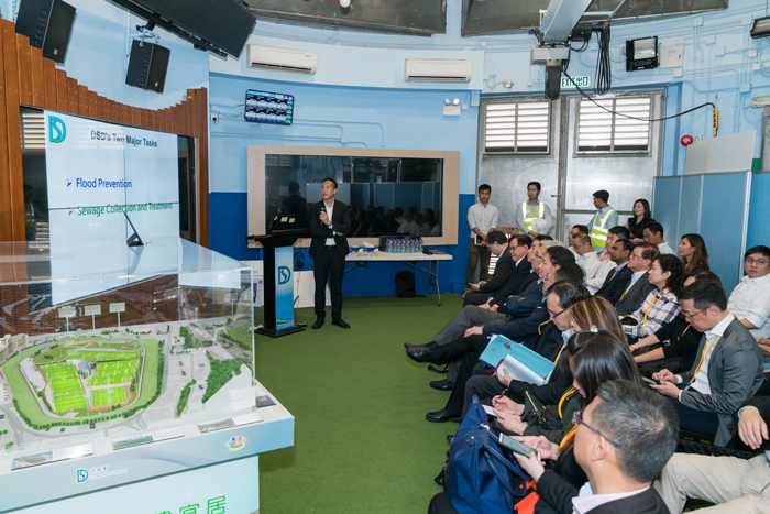 署理渠务署署长麦嘉为先生(前排右六)、助理署长(操作维修)简炎辉先生(前排左五)、助理署长(设计拓展)曾国良先生(前排右四)、发展局项目成本管理专员邝家升先生(前排左六)与代表团合照 排水工程部总工程师梁泳源先生向代表团介绍渠务署的工作 本署人员、工程顾问及承建商与代表团合照 代表团参观跑马地地下蓄洪池