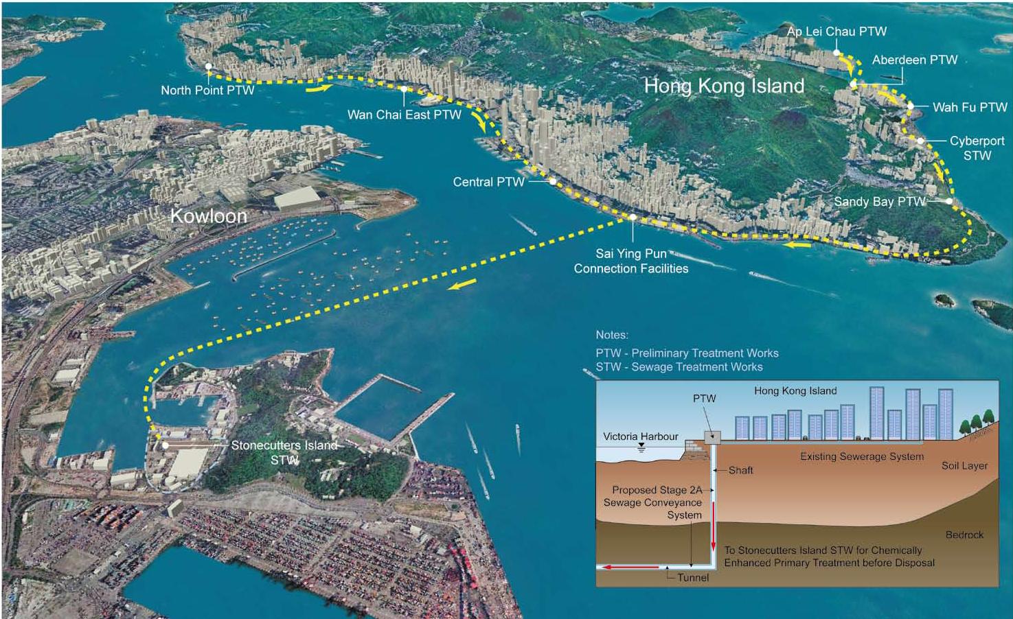 In order to treat the additional sewage from Stage 2A, the existing Stonecutters Island Sewage Treatment Works (SCISTW) will be upgraded. The upgrading works include the expansion of treatment capacity of the existing sewage treatment works from 1.7 to 2.45 million cubic metres of waste water per day. The entire works will be equipped with an advanced odour control system. In addition, works are already underway to disinfect the treated sewage to bring about early improvements to the water quality of the western harbour and the beaches at Tsuen Wan.