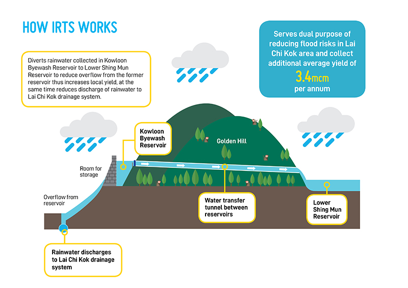 · Prior to heavy rainstorms, the water stored in Kowloon Byewash Reservoir will be conveyed to Lower Shing Mun Reservoir in advance to provide an approximately 350,000m3 flood storage space in Kowloon Byewash Reservoir. This storage capacity allows for collection of surface runoff in Kowloon Byewash Reservoir during heavy rainstorms and reduces the chance of overflow entering the urban areas.