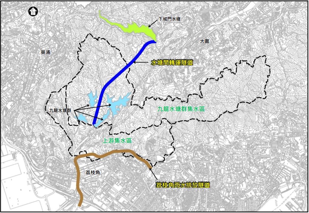 有見及此,渠務署制定了「荔枝角雨水轉運計劃」,當中涉及的工程包括建造荔枝角雨水排放隧道及水塘間轉運隧道,藉以提升上述地區雨水排放系統的排水能力。荔枝角雨水排放隧道已在2012年落成,用以截取上游集水區的地面徑流,直接排放到維多利亞港。水塘間轉運隧道會把九龍水塘群收集的地面徑流轉運至下城門水塘,減少水塘群的溢流進入下游地區的雨水排放系統,從而提升深水埗、長沙灣及荔枝角的防洪能力。同時,轉運到下城門水塘的溢流可再經現有的輸送系統,運送至沙田濾水廠作食水處理,將溢流轉化為食水,藉此保存珍貴的水資源。