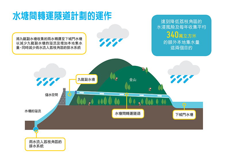 · 雨季來臨前,九龍副水塘的原水會預先經轉運隊道轉運到下城門水塘,騰出約35萬立方米的貯水空間接收雨水,減少暴雨期間出現溢流的機會。