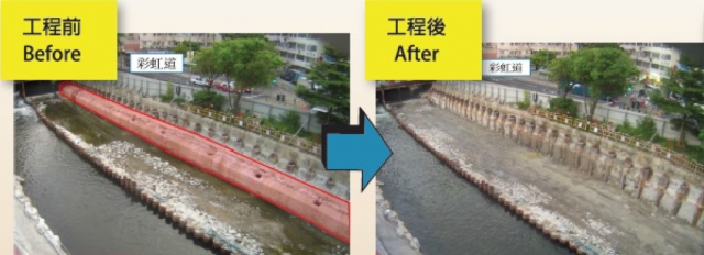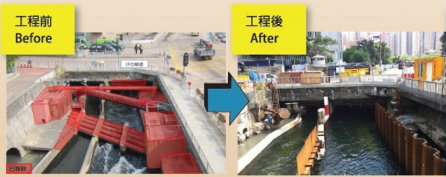 Removal of a sewer in Kai Tak River was completed The river was widened and thus the drainage capacity of the river has been increased.