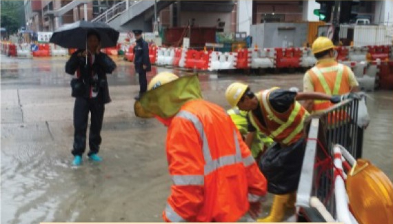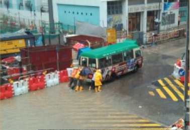 Rainfall was sudden and intensive in the afternoon of 26 September 2015. Amber Rainstorm Warning Signal was issued by the Hong Kong Observatory at 2:20 pm. The rainfall at Wong Tai Sin district once reached 103mm/hr(Black Rainstorm Warning Signal refers to rainfall over 70mm/hr). The existing drainage capacity of Kai Tak River was inadequate as the river improvement works has not been completed yet. Therefore, flooding occurred at Choi Hung Road between Shatin Pass Road and Tai Shing Street due to the intensive rainfall while traffic lanes were closed with broken-down vehicles and adjacent shops were also affected.