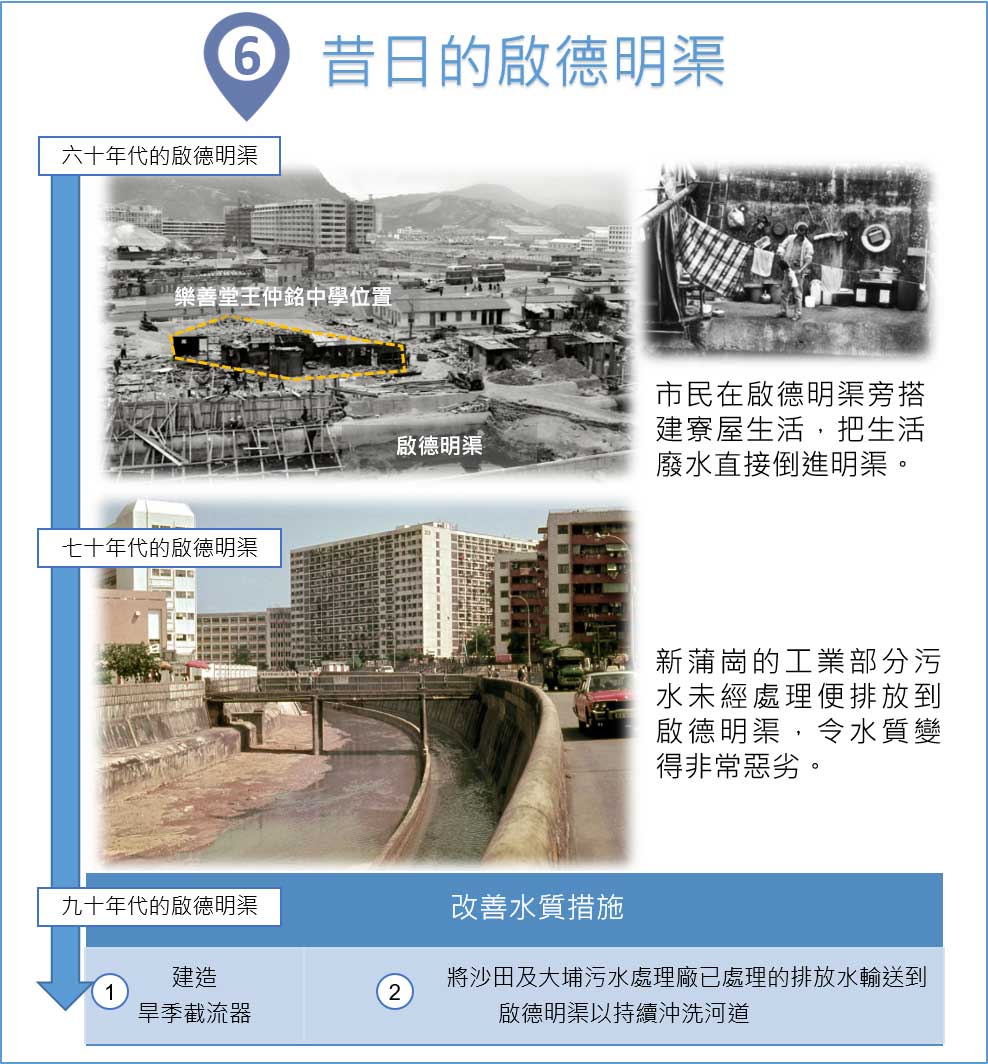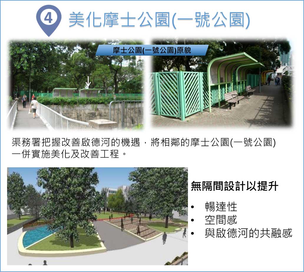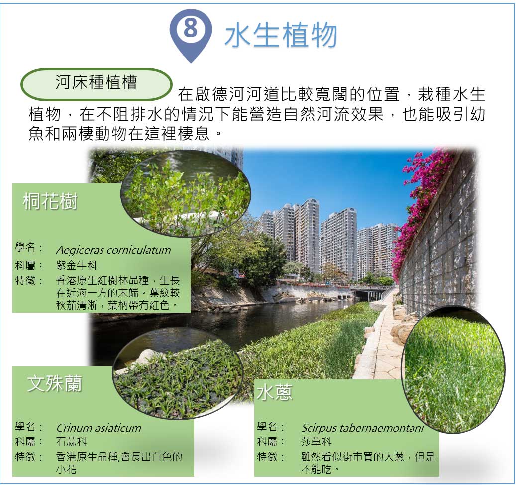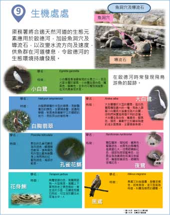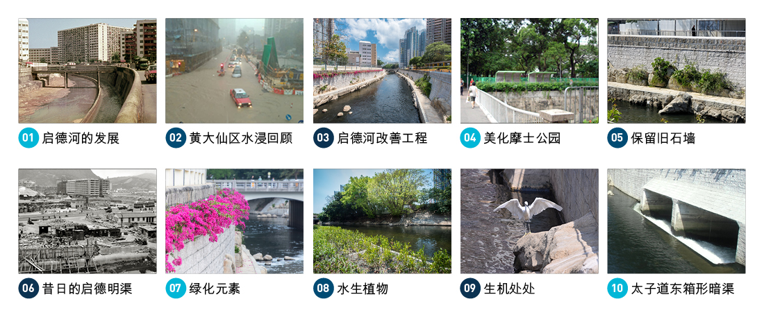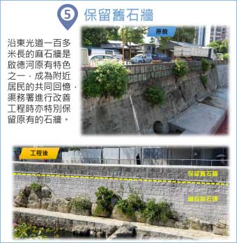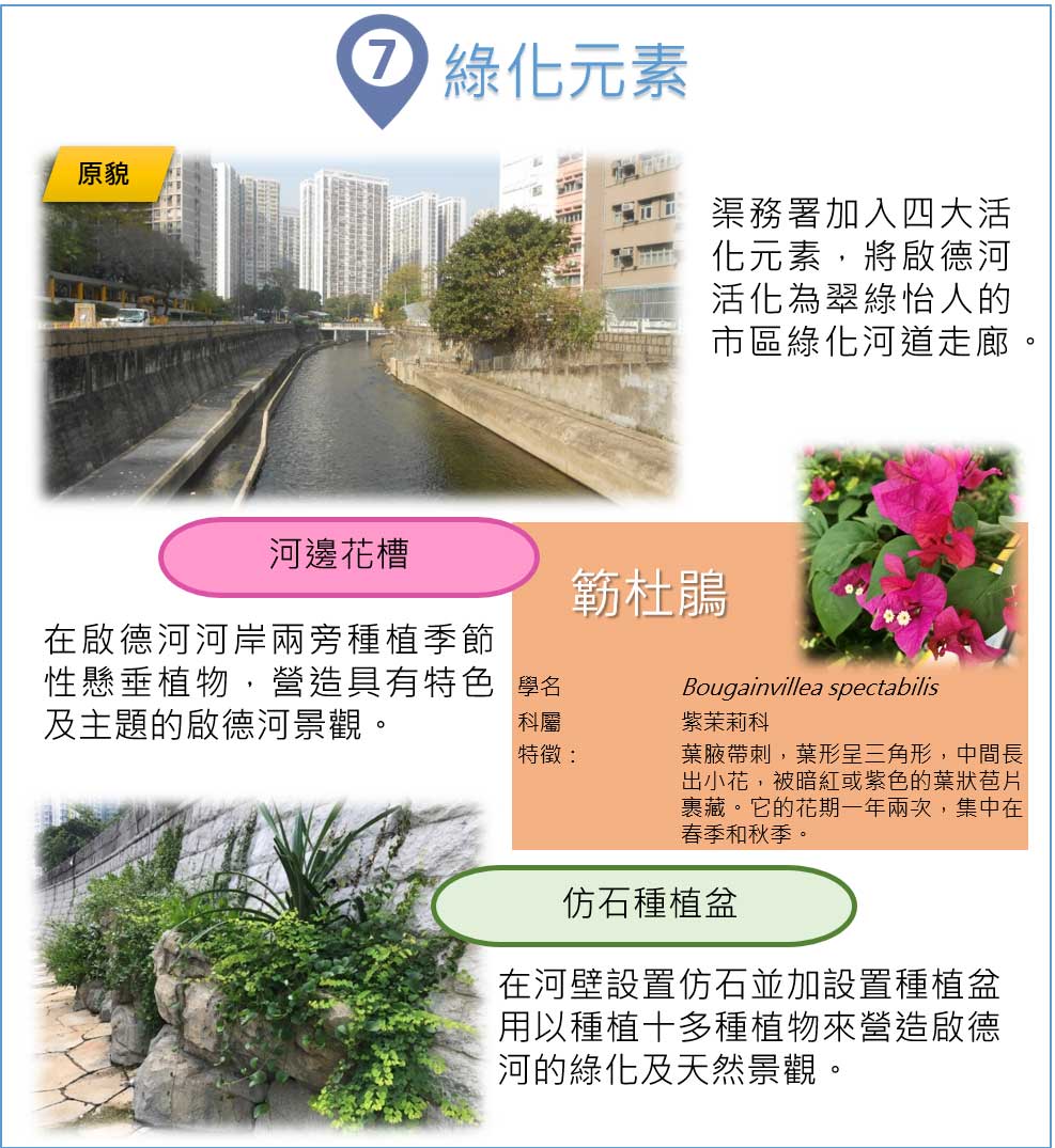 渠务署亦把握机遇,一并优化该处的城市景观,为市民提供休憩景点,以改善居住环境。启德河改善工程因此加入不同绿化及生态元素,将启德河活化成市区绿化河道走廊,展现河道与邻近地区的紧密连系。