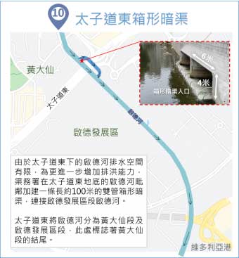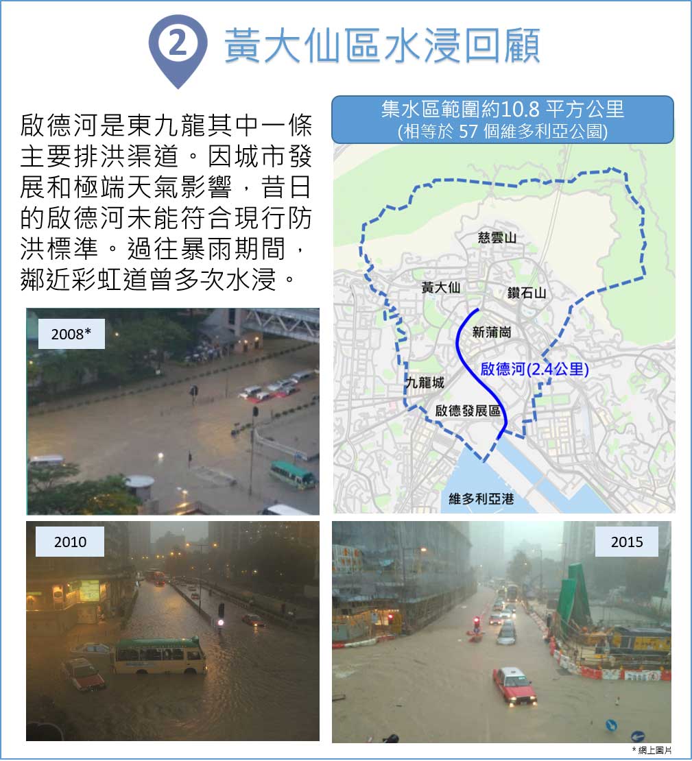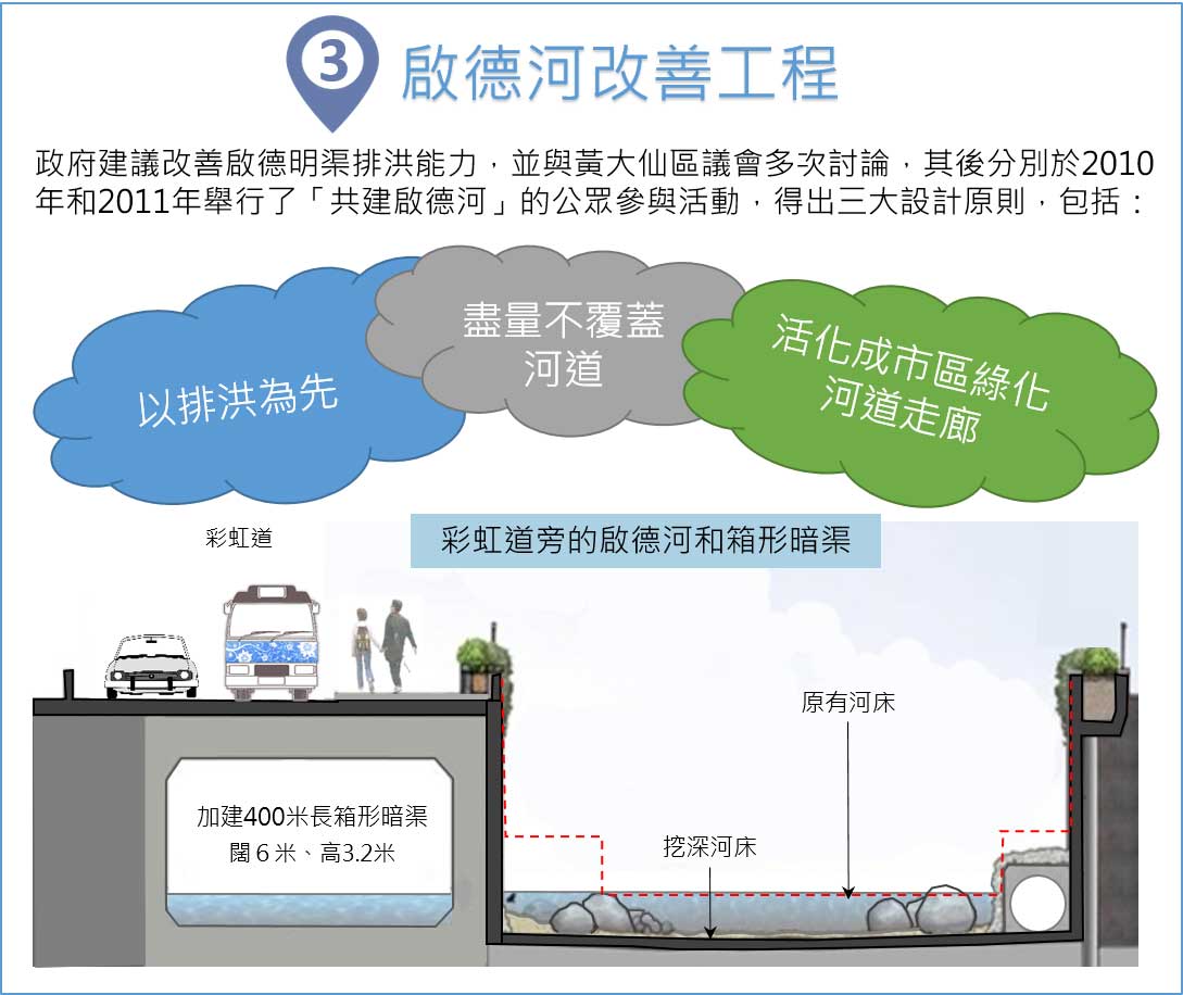启德河旧称启德明渠,总长约2.4公里,是东九龙其中一条主要排洪渠道。由于城市发展及极端天气影响,彩虹道在暴雨期间曾出现严重水浸,影响附近居民生活。由于该渠未达现行防洪标准,渠务署分阶段改善黄大仙区内长1.1公里的渠段,以提升启德河的排洪能力,减低相关地区的水浸风险。工程于2011年10月分阶段展开,并于2018年完成。