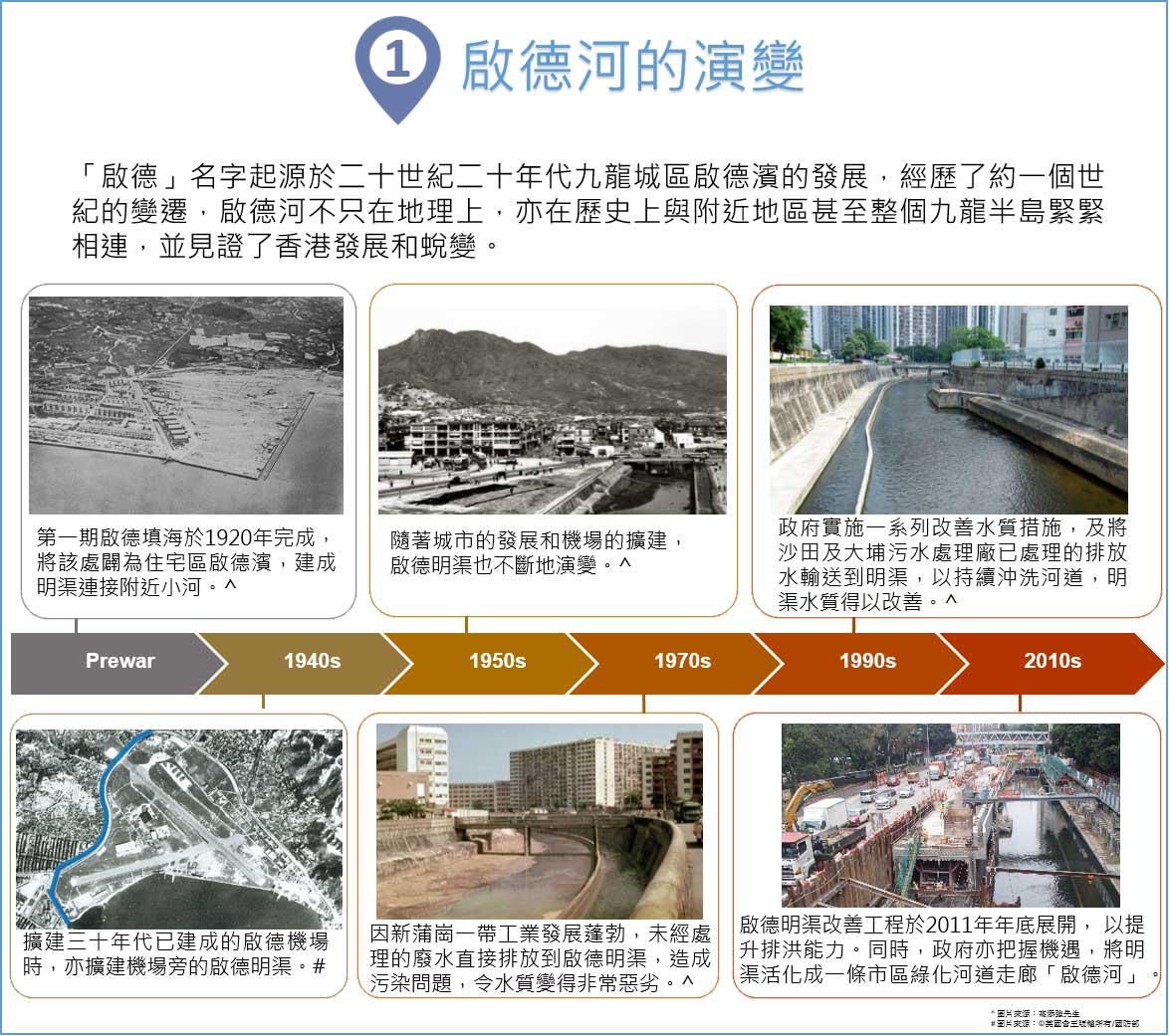 「启德」名字起源于20世纪20年代九龙城区启德滨的发展,经历了约一个世纪的变迁,启德河不只在地理上,亦在历史上与附近地区甚至整个九龙半岛紧紧相连,并见证了香港发展和蜕变。