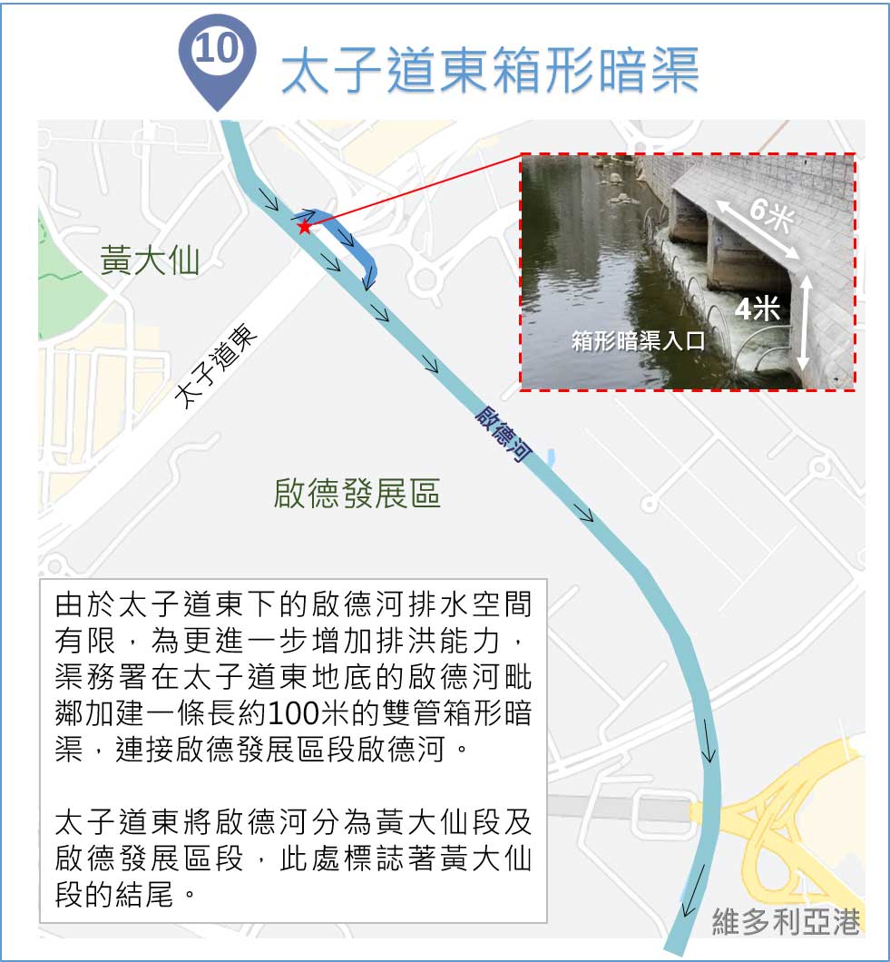 渠务署沿黄大仙段启德河设置导赏径,起点于沙田坳道,沿启德河畔的十个位置设有介绍展板,并于太子道东作为终点,全程约一公里,希望让公众了解更多启德河的历史及改善工程的资讯。