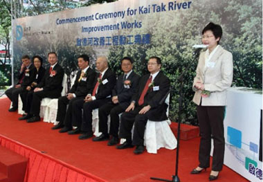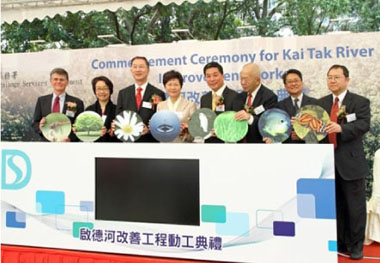 时任发展局局长林郑月娥于2012年3月26日上午在黄大仙摩士公园主持启德河改善工程的动工典礼。她表示渠务署于2010年及2011年举办了「共建启德河」的公众参与活动,收集市民对改善启德河的意见。署方亦就工程的设计及各项美化和生态保育措施,充分谘询及采纳了黄大仙区议会及相关团体的意见。她说:「启德河的改善工程,充分体现了以民为本的施政方针。我们希望透过这项改善工程,加强黄大仙区和启德发展区的融合;保留沿河的历史遗迹之余,也能改善环境,为居民带来优化的社区设施。」一同出席典礼的时任渠务署署长陈志超表示,启德河的改善工程会分三部分进行。上游段改善工程主要包括修复一段由蒲岗村道到东光道长约六百米的启德河,预期2017年竣工,工程项目费用约16亿元。工程透过加深河道、加建暗渠及迁移水管和污水渠,提升排洪能力;同时优化沿河的休憩空间和增加景观美化设施,将启德河打造成富吸引力的绿化河道走廊。中游及下游河段的改善工程将于2013年展开,预计在2018年全部竣工。工程将配合整个启德发展计划,加以绿化和美化。新的河道走廊为市民提供消闲的好去处外,亦可作为休憩、娱乐、教育和社区艺术创作等场地。完善后的启德河将成为贯通新旧区的城市景观轴,促进毗邻旧区和启德新发展区互相融合。出席典礼的嘉宾还有时任黄大仙区议会主席李德康及启德发展民间联席召集人陈婉娴。