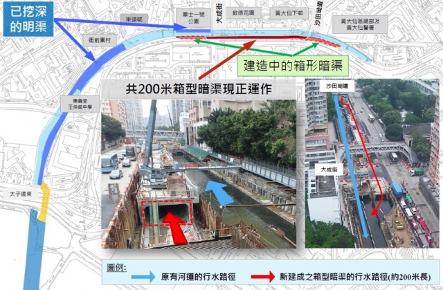 我們已完成由沙田坳道以南至大成街一段在彩虹道底長約200米的箱形暗渠,並挖深了大部分啟德河中游位置的河床,在雨季來臨前提升啟德河的排洪能力。