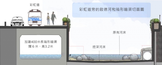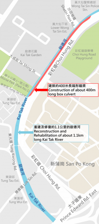 渠務署負責黃大仙區內共1.1公里的啟德河改善工程,並採用兩個改善排洪策略。
