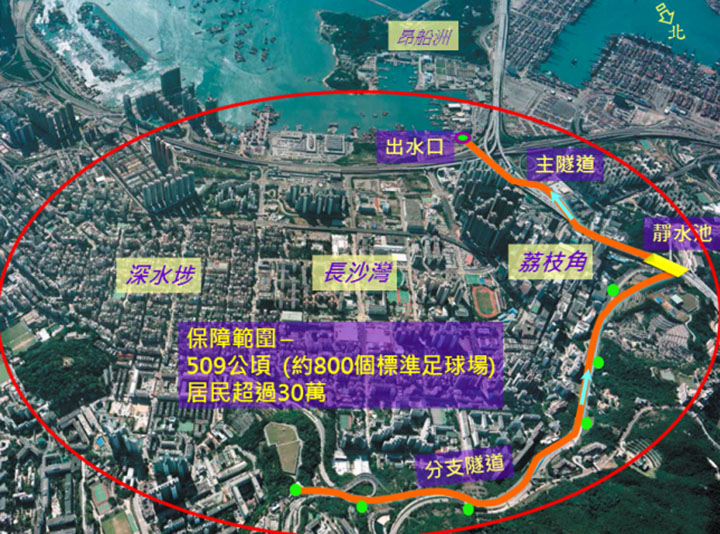 Lai Chi Kok Drainage Tunnel (orange line) adopted an interception approach which six intakes (green dots) are constructed along Northern side of Ching Cheung Road to intercept storm water flow. The intercepted flow is then diverted to the stilling basin via the branch tunnel and then further discharge to the harbor via the main tunnel. The drainage tunnel provides a flood relieve measures for the low-lying urban areas at Lai Chi Kok, Sham Shui Po, and Cheung Sha Wan areas.