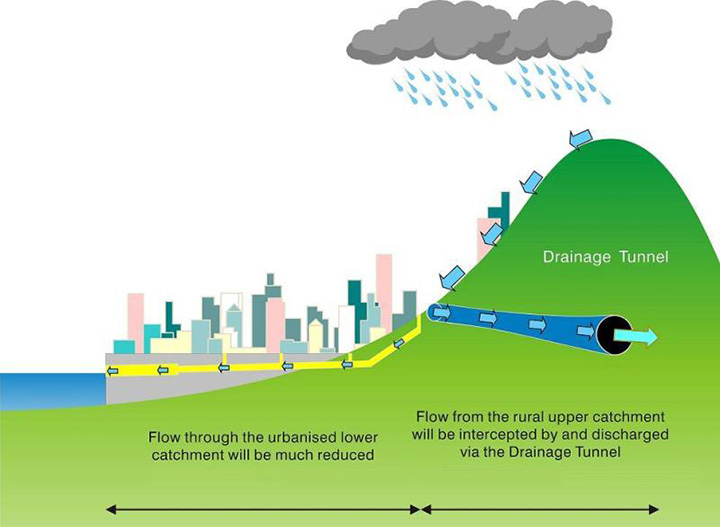 The traditional approach requires enlarging the existing drainage system within urban area while the tunnel interception approach is an innovative flood relief measure. The construction work sites are located in rural areas such that extensive road openings can be avoided. This tunnel interception approach minimizes the disturbances to the public, traffic, and commercial activities and at the same time achieving the flood relief purpose.