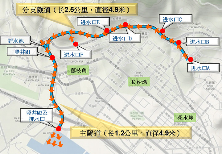 「荔枝角雨水排放隧道」位于九龙西北部,隧道全长3.7公里,由一段2.5公里长沿半山兴建的「分支隧道」,及一段1.2公里长贯通荔枝角市区地底的「主隧道」组成,两段隧道中间设有静水池,出水口位于昂船洲。