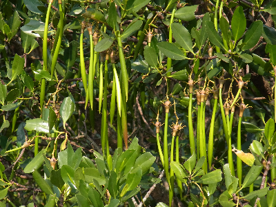 某些紅樹有掛在樹枝上的筆狀胚軸。胚軸是已經萌芽的種子,當胚軸成熟落在泥土上,就可加速長成樹苗。外形獨特的紅樹胚軸也是辨認紅樹的好方法。