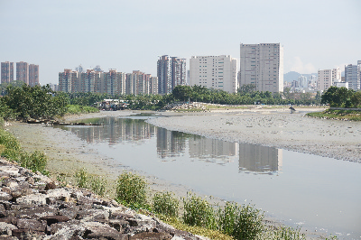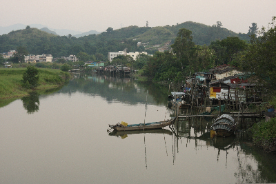 從這裏向元朗市中心方向望,不遠處就是錦田河的天然舊河道與山貝河交匯之處。現在錦田河與山貝河在南生圍以北匯合,但是在河道整治工程之前,錦田河天然舊河道與山貝河交匯之處是在南生圍以南。