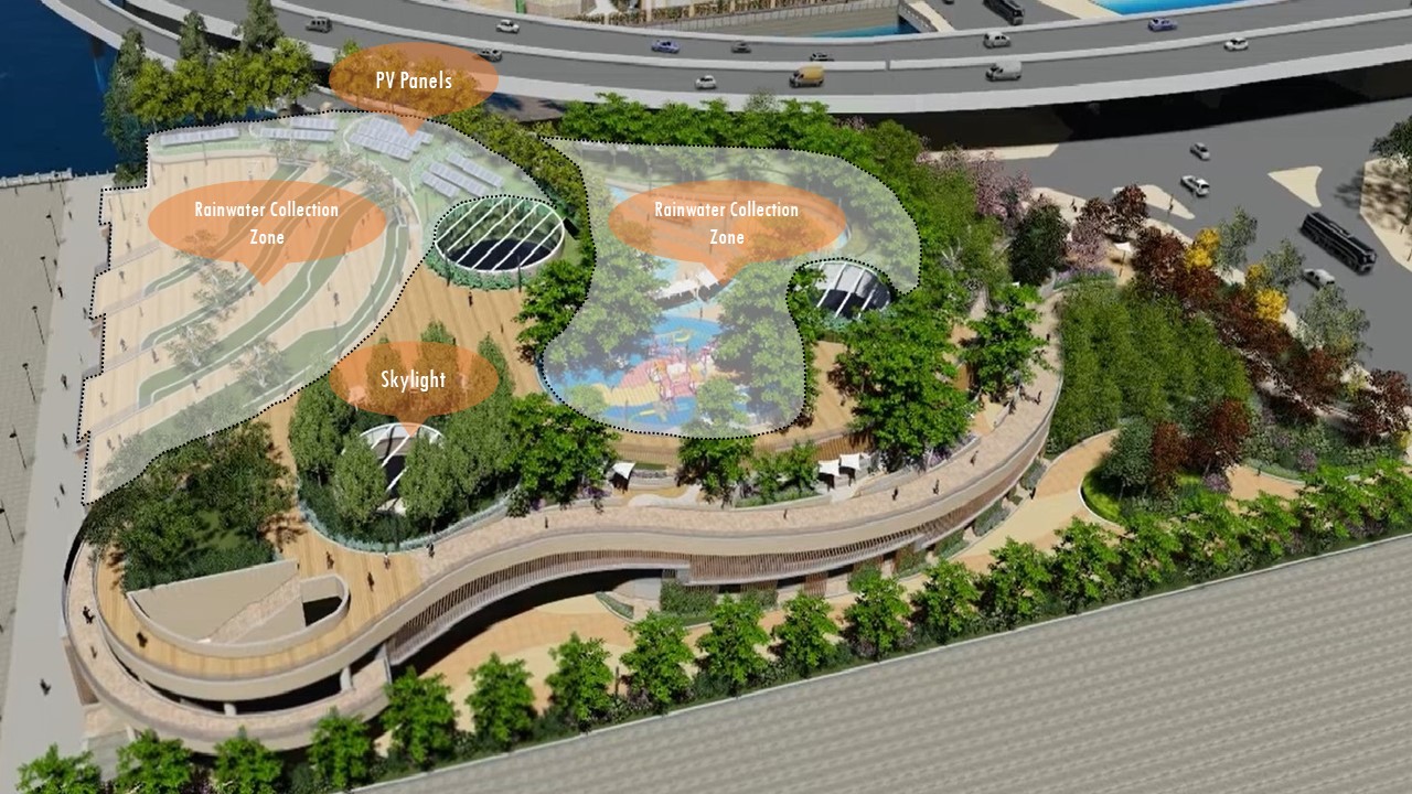 Higher energy efficiency is another key design element of this project Various environmental friendly elements such as skylight areas and solar panels have been added. Skylight areas have been designed to channel natural daylight to the interiors, thus reducing the energy consumption otherwise used for lighting purposes. The use of natural daylight also enhances the spatial perception of the area, allowing the open space to seem more spacious to visitors. On the other hand, considering the overall aesthetic design and layout of the park, solar panels will be placed in areas that are inaccessible to the public. The solar panels are expected to power up the electrical appliances and lightings within the park, serving as a more eco-friendly and economical solution which helps reduce the facility’s carbon footprint.