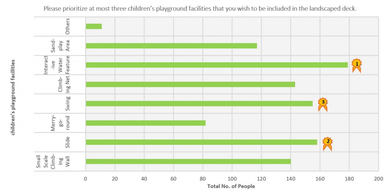 调查发现,就七项不同的儿童游乐设施而言,受访者认为「互动嬉水区」设施最为吸引。其次为「滑梯」及「秋千」,均有超过150名受访者拣选为最喜爱的三款设施之一。 另外,「绳网阵」、「小型攀石墙」亦受约四成受访者的喜爱。