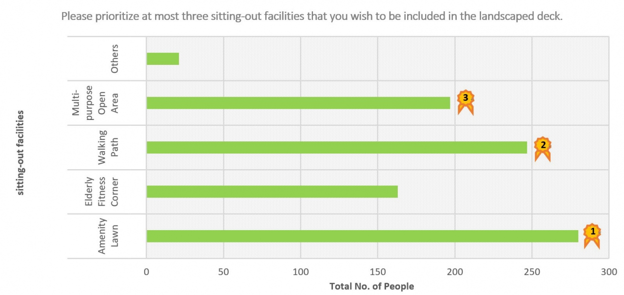 此外,有关「希望园景平台能够提供的休憩设施」的问题,受访者认为「可供休憩的草坪」最为吸引。他们表示现时香港市区缺少绿化,故希望是项工程能与观塘基本污水处理厂互相配合,将园景平台打造成为观塘区的「工业绿洲」。其次受欢迎的休憩设施为「散步径」及「开放式综合园地」。受访者认为开放式的综合园地用途广泛,能同时切合不同用家的需要。
