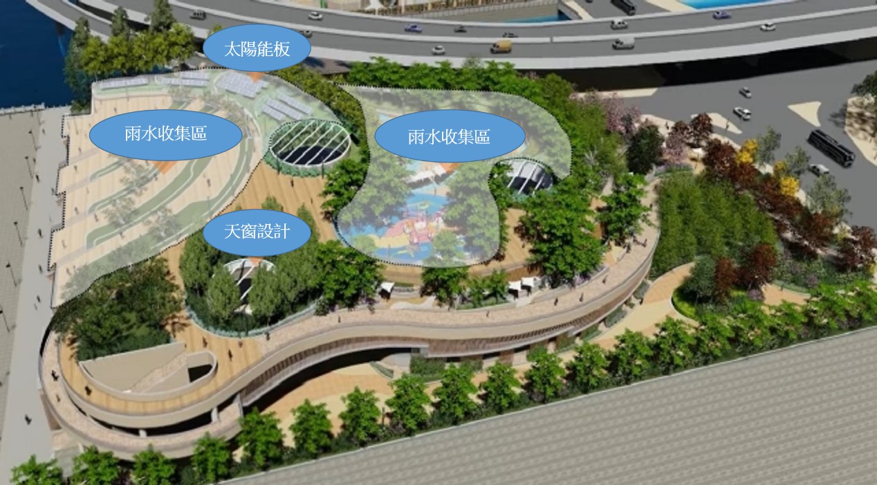 节省能源亦是本项目的重点之一。我们在园景平台加入了不少环保元素,当中包括天窗设计和太阳能板。前者可以把自然光带入下层室内的部分,减少灯光耗电,同时增加室内的空间感。太阳能板方面,考虑到公园的布局和美观,我们会将太阳能板放置于公园较少人流的地方。太阳能板所产生的电力将可用作公园照明和其他电机用途,从而节省公园的运行成本,减少碳排放,保护环境。