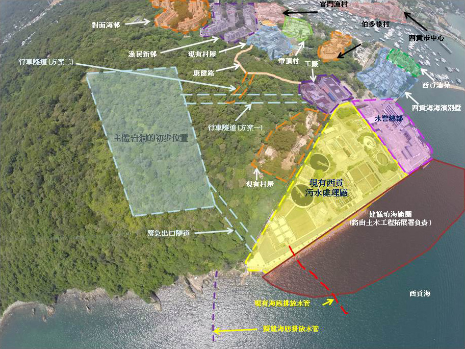 研究顧問在擬議重置選址時,已將現有西貢污水處理廠附近四個適合作岩洞建設的地點作比較,包括大環、北港、大涌口及蕉坑。