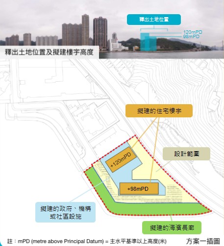 以上兩個方案皆建基於住用最高地積比率為6.0的條件,若有限度再增加地積比率,應可增加提供社區設施的靈活性及發展潛力,以致這幅珍貴土地可以地盡其用。我們樂意聽取公眾就這方面的意見。