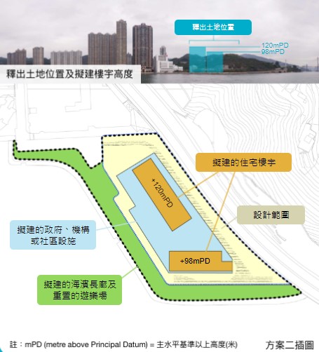 擬議兩個釋出土地的初步規劃方案,即方案一和方案二。方案一只會搬遷深井污水處理廠,而方案二則會搬遷深井污水處理廠及中電變電站,並重新規劃深慈街遊樂場。