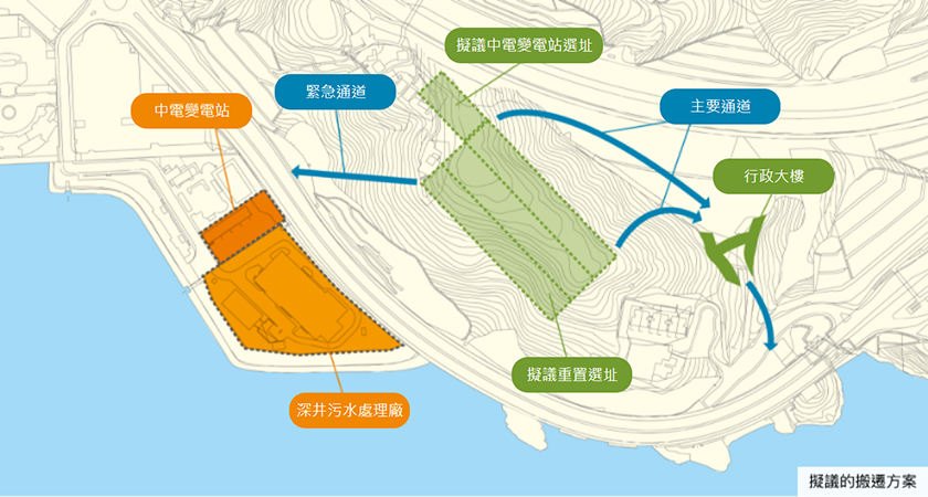 建議搬遷的地點座落於青山公路–深井段及屯門公路之間的山坡,擬議的搬遷工程包括挖掘岩洞、於岩洞內興建污水處理廠及中電變電站(如適用)、隧道進出口及緊急通道。